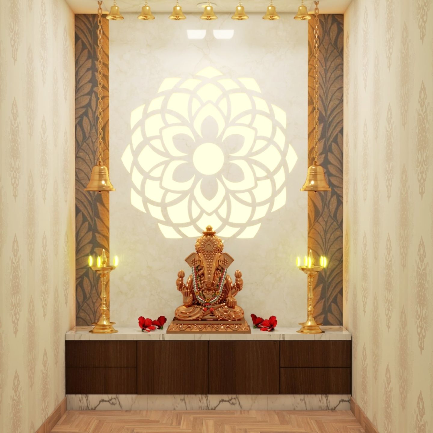 Contemporary Pooja Unit with Beige Floral Wall Panel and Decorative Bells